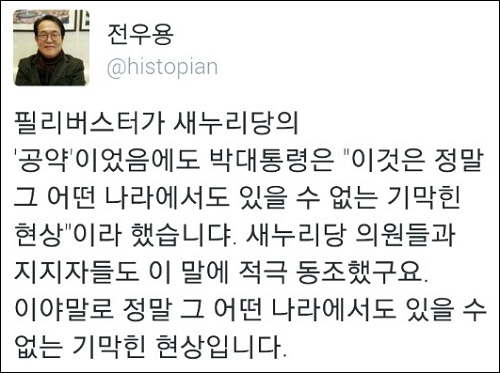 이 같은 사실이 알려지자 역사학자 전우용 씨는 26일 자신의 트위터를 통해 “필리버스터가 새누리당의 ‘공약’이었음에도 박 대통령은 ‘이것이 정말 그 어떤 나라에서도 있을 수 없는 기막힌 현상’이라 했다. 새누리당 의원들과 지지자들도 이 말에 적극 동조했다”며 “이야말로 정말 그 어떤 나라에서도 있을 수 없는 기막힌 현상”이라고 꼬집었다.