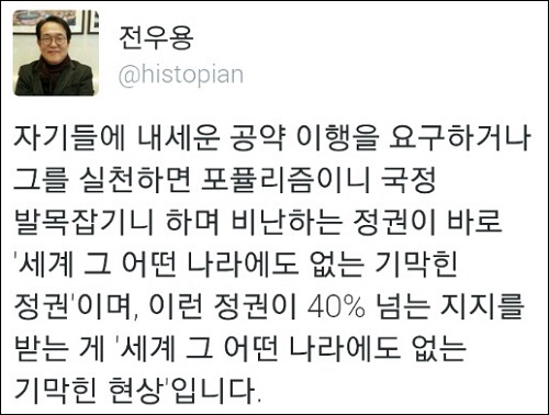 그는 “자기들이 내세운 공약 이행을 요구하거나 그를 실천하면 포퓰리즘이니 국정 발목잡기니 하며 비난하는 정권이 바로 ‘세계 그 어떤 나라에도 없는 기막힌 정권’”이라며 “이런 정권이 40% 넘는 지지를 받는 게 ‘세계 그 어떤 나라에도 없는 기막힌 현상”이라고 거듭 강조했다.