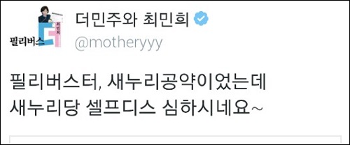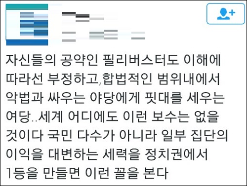 트위터 이용자 ‘임**’는 “자신들의 공약인 필리버스터도 이해에 따라선 부정하고, 합법적인 범위 내에서 악법과 싸우는 야당에게 핏대를 세우는 여당.. 세계 어디에도 이런 보수는 없을 것”이라며 “국민 다수가 아니라 일부 집단의 이익을 대변하는 세력을 정치권에서 1등을 만들면 이런 꼴을 본다”고 개탄했다.