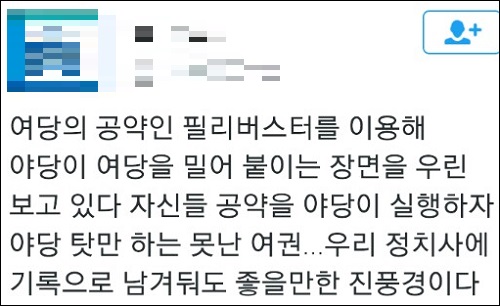 그는 또 “여당의 공약인 필리버스터를 이용해 야당이 여당을 밀어붙이는 장면을 우린 보고 있다”며 “자신들 공약을 야당이 실행하자 야당 탓만 하는 못난 여권... 우리 정치사에 기록으로 남겨둬도 좋을만한 진풍경”이라고 평가했다.