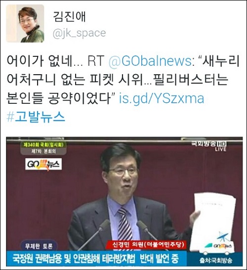 25일 8번째 토론자로 나선 더불어민주당 신경민 의원은 새누리당 지도부와 의원들이 필리버스터 규탄 피켓 시위를 벌인 데 대해 “어처구니없는 시위가 본회의장 바로 문밖에서 벌어지고 있다”며 ‘필리버스터는 새누리당의 공약이었다’고 언급했다. 신 의원의 발언 직후 새누리당 홈페이지는 순간 접속자 폭주로 한 때 마비되기도 했다.