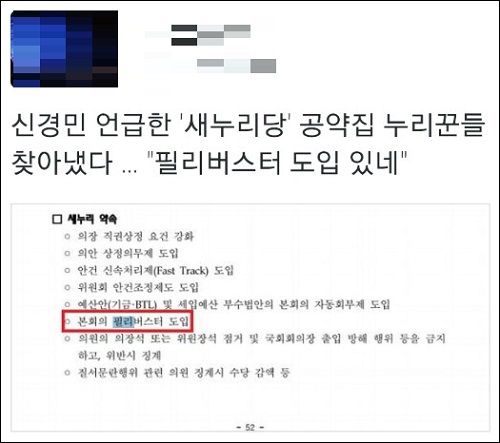 여당이 일명 ‘국민감시법(테러방지법)’ 국회 통과를 막기 위해 필리버스터(무제한토론)를 벌이고 있는 야당에 대해 규탄 피켓 시위를 벌이는 등 강력 반발했지만 정작 ‘필리버스터’가 새누리당의 공약이었던 것이 드러나 비난을 사고 있다.