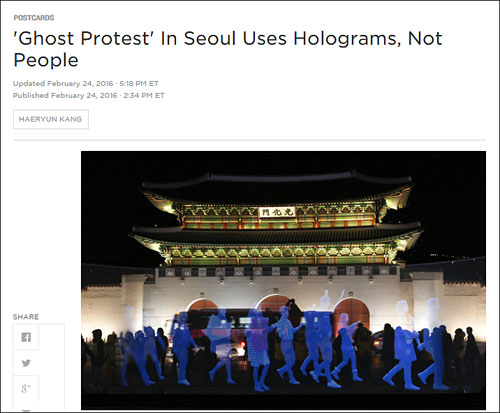 NPR은 24일 국제앰네스티 한국지부가 갈수록 표현의 자유를 억압하는 박근혜 정부를 비난하기 위해 서울에서 홀로그램을 이용한 ‘유령시위’를 벌인 소식을 보도했다.