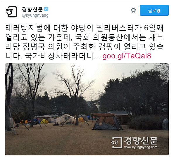 그런데 본회의장 옆 국회 의원 동산에서 새누리당 정병국 의원이 주최한 ‘국회와 함께하는 친환경·안전캠핑’ 캠페인과 1박 2일 캠핑이 열렸습니다.