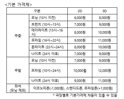 그런 CGV가 다음달부터 좌석별∙시간대별로 관람료를 세분화한다고 발표했다. 마치 비행기 좌석처럼 이코노미존(Economy Zone) ∙ 스탠다드존(Standard Zone) ∙ 프라임존(Prime Zone) 이렇게 세 단계로 구분해 가격을 차등화하고, 영화 상영시간에 따라 모닝(10시 이전), 브런치(10시~13시), 데이라이트(13시~16시), 프라임(16~22시), 문라이트(22시~24시), 나이트(24시 이후)의 6단계로 구분해 관람료를 달리 하겠다는 것이다.