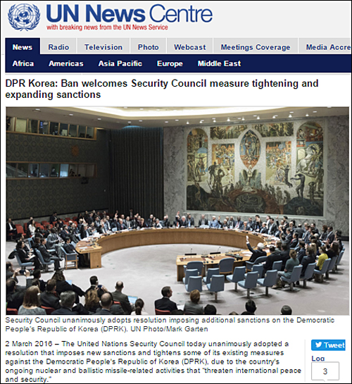 UN News Centre는 3일 유엔의 대북 제재 결의안 채택과 관련한 <DPR Korea: Ban welcomes Security Council measure tightening and expanding sanctions>(3/2, http://me2.do/xnd2UdJF)에서 결의안은 대북 제재 조치가 북한 주민이나 경제 활동 등에 부정적 영향을 미칠 의도가 아니라는 점을 여러 번 강조했다(“Finally, the 19-page text underlines several times that measures imposed by it are not intended to have negative effects on the country's citizens. “Measures imposed […] and this resolution are not intended to have adverse humanitarian consequences for the civilian population of the DPRK or to affect negatively those activities, including economic activities and cooperation.”)고 보도했다.