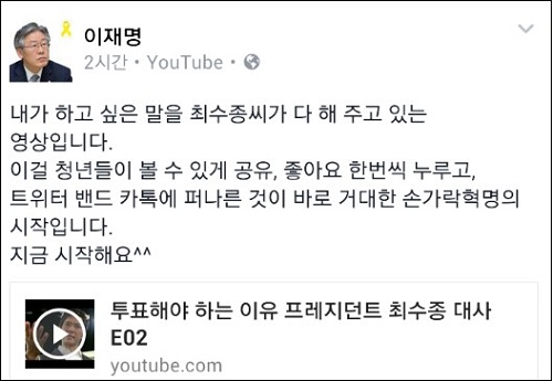 이 시장은 “이걸 청년들이 볼 수 있게 공유, 좋아요 한번씩 누르고, 트위터, 밴드, 카톡에 퍼 나르는 것이 바로 거대한 손가락 혁명의 시작”이라며 동참을 권유했다.