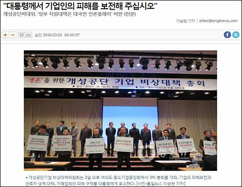 연합뉴스의 이 기사는 〈통일뉴스〉가 2일 〈"대통령께서 기업인의 피해를 보전해 주십시오"〉(03.02 18:10:57) 기사에서 개성공단기업 비상대책위원회(개성공단비대위)가 2일 오후 서울 여의도 중소기업중앙회에서 3차 총회를 개최, 기업의 피해 보전과 근로자 생계 대책, 거래업체의 피해 구제를 대통령에게 호소하면서 “북측 근로자 5만 4천여 명, 4인 가족 기준으로 20만 명 이상의 북측 주민들이 생계가 막막해 졌고 이 자리에 모인 사람들이 모두 졸지에 도산과 실직의 위험에 처하게 됐다. 북한을 제재할 필요가 분명히 있지만 이번 개성공단 전면 중단 결정에 대해 납득할 수 없는 이유가 거기에 있다”고 주장하면서 “사태 진전에 아무런 책임이 없는 기업인과 근로자, 가족들에게 직접적으로 어려움을 가중시키는 이와 같은 제재는 인권과 인도주의 차원에서도 결코 있어서는 안 될 일이라고 강조했다”는 내용과 크게 대비된다.