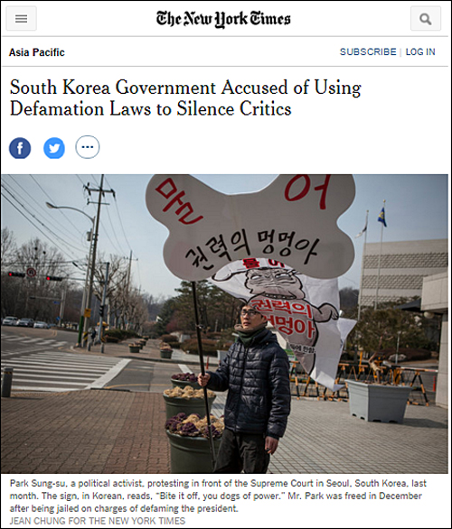 미 뉴욕타임스(NYT)는 대통령 명예를 훼손했다는 혐의로 8개월간 구치소에 구금됐던 ‘둥글이’ 박성수 씨 사례를 통해 명예훼손 법령의 남용실태를 고발한다. NYT는 박 씨의 사연을 소개하면서 명예훼손 법령이 모호해 검찰이 이를 남용할 소지가 높다고 지적했다.