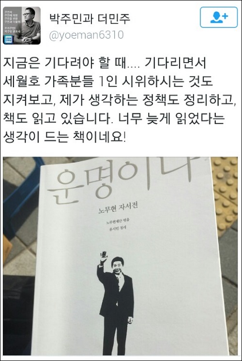 이런 가운데 정작 당사자인 박주민 변호사는 “지금은 기다려야 할 때”라며 “기다리면서 세월호 가족분들 1인 시위하시는 것도 지켜보고, 제가 생각하는 정책도 정리하고, 책도 읽고 있습니다. 너무 늦게 읽었다는 생각이 드는 책이네요!”라는 짧은 심경을 담은 글을 SNS에 올렸다.