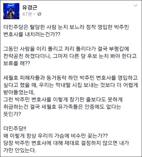 그는 “세월호 피해자들과 동고동락 하던 박주민 변호사를 영입하고 싶다고 했을 때, 우리는 막내딸 시집보내는 것보다 더 어렵게 받아들였는데, 그런 박주민 변호사를 이렇게 장기판 졸보다도 못하게 취급하는 건 결국 세월호 유가족들은 안중에도 없다는 뜻인가?”라며 강하게 질타했다.