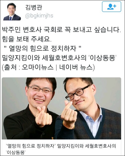 앞서 경기 성남 분당갑에 전략공천된 김병관 비대위원은 지난 2월 자신의 트위터에 “박주민 변호사 국회로 꼭 보내고 싶습니다. 힘을 보태주세요”라는 글을 남기기도 했다.