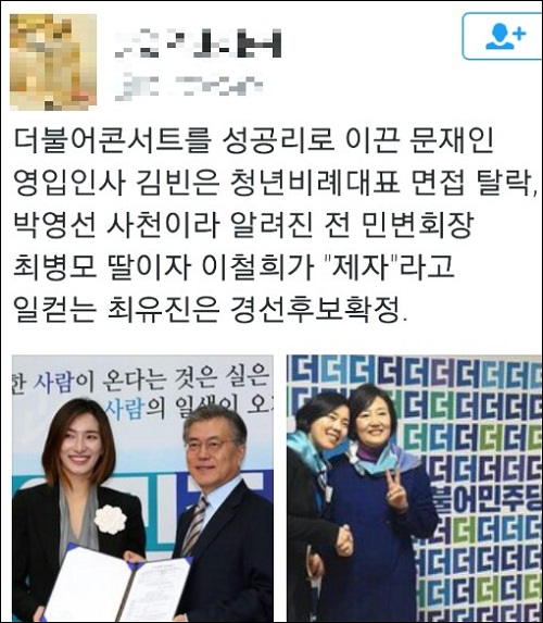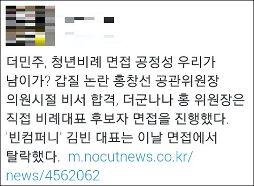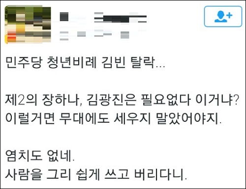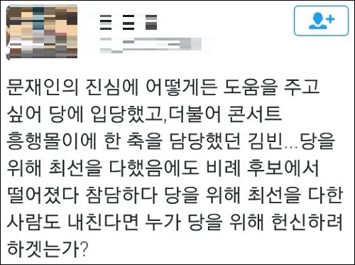 트위터 이용자 ‘임**’ 씨는 “문재인의 진심에 어떻게든 도움을 주고 싶어 당에 입당했고, 더불어 콘서트 흥행몰이에 한 축을 담당했던 김빈.. 당을 위해 최선을 다했음에도 비례 후보에서 떨어졌다. 참담하다. 당을 위해 최선을 다한 사람도 내친다면 누가 당을 위해 헌신하려 하겠는가”라고 질타했다.