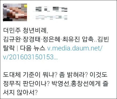 그는 이해찬 의원 컷오프를 두고 “정무적 판단이었다”는 김종인 비대위 대표의 발언에 빗대 “내 정무적 판단으로는 박영선 이종걸을 포함해 단수공천을 받은 비대위원들, 인지도 높은 김빈을 대신해 뽑힌 청년 비례들을 확실하게 떨어뜨리지 않으면 총선 이후 더민주는 분당사태까지 치달을 수 있다”고 날선 비판을 가했다.