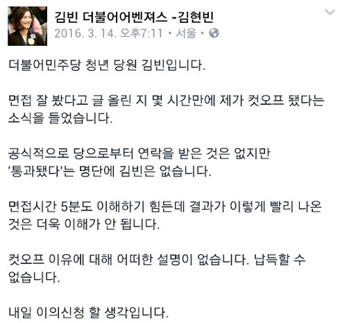 이에 14일 김빈 대표는 자신의 페이스북을 통해 탈락 소식을 전하며 “면접 잘 봤다고 글 올린 지 몇 시간 만에 제가 컷오프 됐다는 소식을 들었다”며 “면접 5분도 이해하기 힘든데 결과가 이렇게 빨리 나온 것은 더욱 이해가 안 된다”고 심경을 전했다.