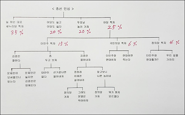 국민의당 지지자들의 마음에 대해선 ‘더민주랑 연대하자’, ‘연대하면 죽는다’로 간단하게 정리했다. 정의당에 대해서도 ‘더민주랑 연대할까?’, ‘우리 길을 가야지’로 짤막하게 정리했다.