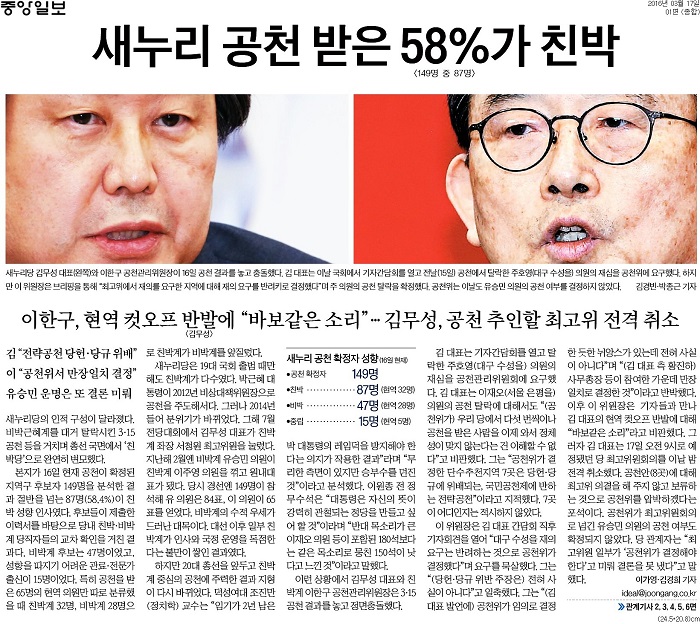 <중앙>은 “현재 공천이 확정된 지역구 후보자 149명을 분석한 결과 절반을 넘는 87명(58.4%)이 친박 성향 인사였다”고 보도했다.