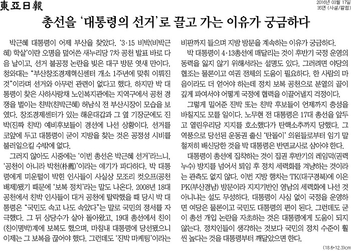 그런가하면 <동아일보>는 “총선을 ‘대통령의 선거’로 끌고 가는 이유가 궁금하다”는 제목의 사설에서 박 대통령이 총선을 앞두고 대구와 부산을 방문한 것을 두고 “선거를 코앞에 두고 대통령이 굳이 지방을 찾는 것은 공정성 시비를 불러일으킬 수밖에 없다”고 지적했다.