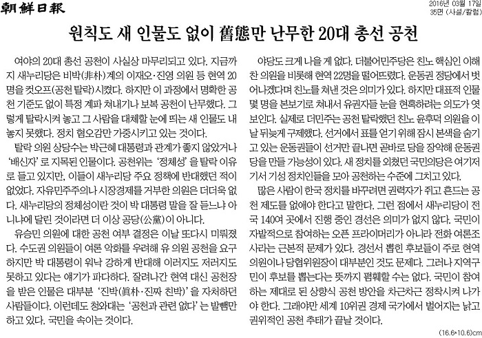 <조선일보>는 17일자 “원칙도 새 인물도 없이 舊態만 난무한 20대 총선 공천”이란 제목의 사설을 통해 “탈락 의원 상당수는 박근혜 대통령과 관계가 좋지 않거나 ‘배신자’로 지목된 인물”이라며 “공천위는 ‘정체성’을 탈락 이유로 들고 있지만, 이들이 새누리당 주요 정책에 반대했던 적이 없었다”고 지적했다.
