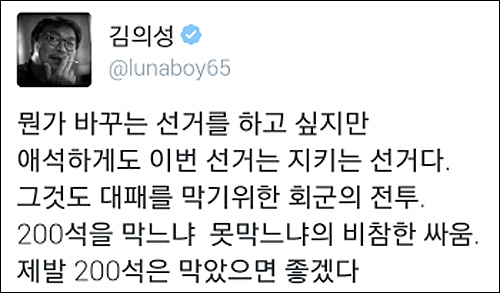 그러면서 20대 총선에 대해 김씨는 “뭔가 바꾸는 선거를 하고 싶지만 애석하게도 이번 선거는 지키는 선거다, 그것도 대패를 막기 위한 회군의 전투”라며 “200석을 막느냐 못막느냐의 비참한 싸움”이라고 분석했다. 그는 “제발 200석은 막았으면 좋겠다”고 말했다.