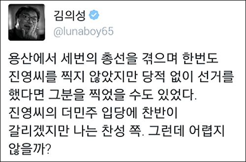 ‘쌍용자동차 사태’, ‘세월호 참사’ 등 사회 현안에 소신 발언을 해온 배우 김의성씨는 트위터에 “진영씨의 더민주 입당에 찬반이 갈리겠지만 나는 찬성 쪽. 그런데 어렵지 않을까?”라고 의견을 올렸다.
