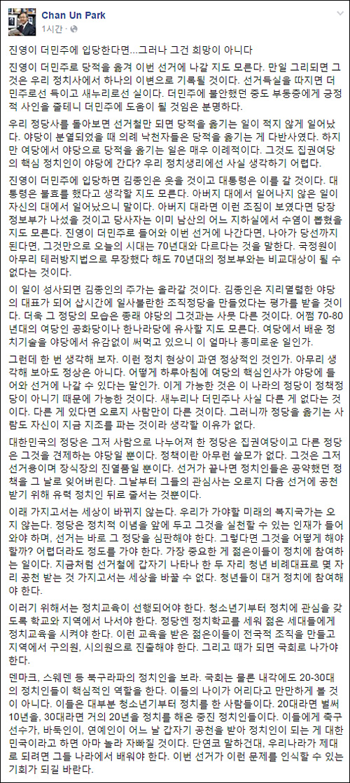 박 교수는 페이스북에서 “어떻게 하루아침에 여당의 핵심인사가 야당에 들어와 선거에 나갈 수 있다는 말인가”라며 이같이 비판했다.