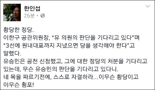 이한구 위원장이 유승민 의원에 결단을 촉구한 것을 두고 한인섭 서울대 법학전문대학원 교수는 “황당한 정당”이라는 반응을 보였다.