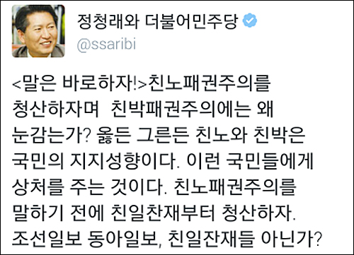 정 의원은 “친노패권주의를 말하기 전에 친일잔재부터 청산하자”며 “조선일보 동아일보, 친일잔재들 아닌가?”라고 보수언론의 과거사를 겨냥하기도 했다.