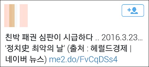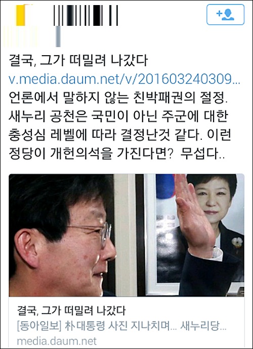 ‘유승민 사태’ 관련 의견이 쏟아지고 있는 SNS에서는 “친박패권이 유승민을 유력대권주자로 만들었다”, “친박패권의 광기를 여실하게 보여 주고 있다”, “우리 정치를 어지럽게 만드는 ‘새누리 친박패권’”, “새누리는 시대의 가장 기초적인 정의 상식을 짓밟은 그낭 패권 패거리일 뿐이다” 등의 글들이 이어졌다.