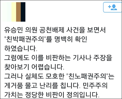 또 유승민 의원에 대해 정 의원은 “나는 유 의원의 정치노선에 동의하지 않는다”면서도 “그러나 유 의원에 대한 반민주적 폭거에 대해서는 다른 공간에서 함께 싸우겠다”고 밝혔다.