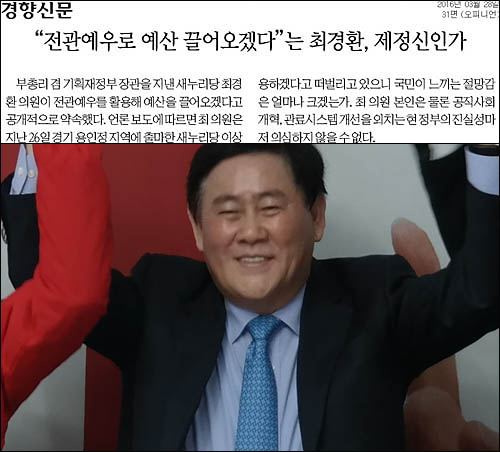 경향신문은 기사와 사설을 통해 강한 비판을 쏟아냈다. 먼저 <최경환 “예산 확실히 보내주겠다”>(3/28, 3면,http://me2.do/5oAsq5f8)에서는 최 의원이 “‘전관예우’를 활용한 예산폭탄론을 들”었다며 “이 같은 ‘전관예우 팔이’는 박근혜 정부가 강조해온 ‘비정상의 정상화’와도 어긋난다”고 지적했다.