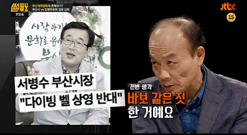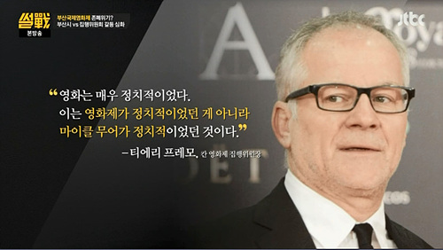 전 변호사는 31일 방송된 JTBC ‘썰전’에서 “서병수 부산시장이 바보같은 짓을 한 것”이라면서 마이클 무어 감독의 <화씨 9/11> 논란 당시 티에리 프레모 칸 영화제 위원장이 한 말을 상기시켰다.