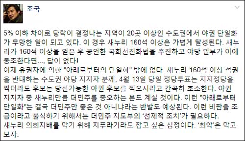 조국 서울대 법학전문대학원 교수는 3일 페이스북에서 “이제 유권자에 의한 ‘아래로부터의 단일화’ 밖에 없다”고 말했다.