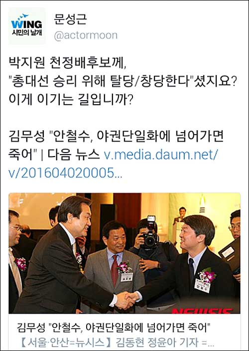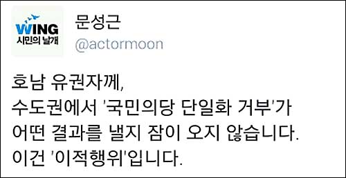 ‘시민의 날개’ 문성근 대표는 트위터에서 “호남 유권자께, 수도권에서 ‘국민의당 단일화 거부’가 어떤 결과를 낼지 잠이 오지 않는다”며 “이건 ‘이적행위’”이라고 맹비난했다.