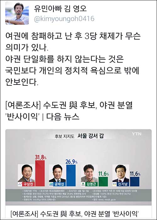 세월호 희생자 유가족 ‘유민아빠’ 김영오씨는 “여권에 참패하고 난 후 3당 체제가 무슨 의미가 있나”라며 “야권 단일화를 하지 않는다는 것은 국민보다 개인의 정치적 욕심으로 밖에 안보인다”고 비판했다.