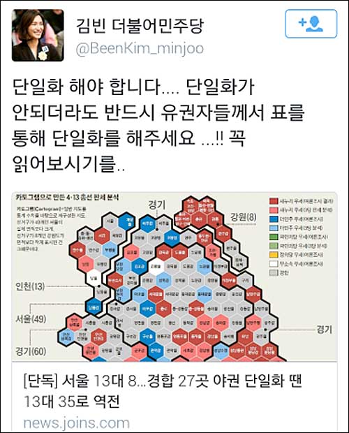 청년비례대표 후보 탈락 후 더불어민주당 ‘더컸유세단’에서 백의종군하고 있는 김빈 빈컴퍼니 대표는 “단일화 해야 한다”면서 “단일화가 안되더라도 반드시 유권자들께서 표를 통해 단일화를 해주세요”라고 호소했다.