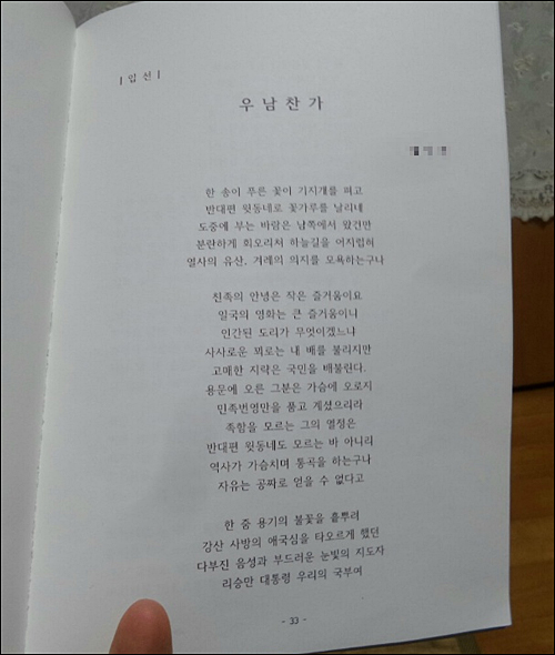4일 한겨레신문에 따르면 자유경제원이 공개한 ‘제1회 건국대통령 이승만 시 공모전 수상작품집’에 ‘우남찬가’라는 제목의 시가 입선작 8편 중 하나로 등재돼 있다. 해당 작품은 4일 오전 수상집 목록에서 삭제돼 있다.