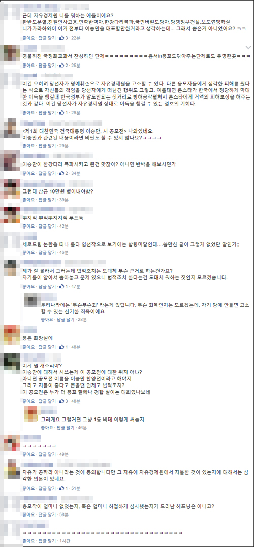 이같은 조치에 네티즌들은 자유경제원 게시판과 SNS, 인터넷 커뮤니티 등에 “자기들이 알아서 뽑아놓고 문제 있으니 법적조치 한다는 건 도대체 뭐하는 짓인지 모르겠다”, “이승만에 대해서 시쓰는 게 이 공모전에 대한 취지 아냐? 아니면 공모전 이름을 이승만 찬양전이라고 해야지 그리고 지들이 좋다고 뽑을 땐 언제고 법적조치?”, “응모작이 얼마나 없었는지, 혹은 얼마나 허접하게 심사했는지가 드러난 해프닝은 아니고?”, “심사 과정에서 거르지 못 한 심사쪽이 문제잖아”, “헌법에도 나와 있는 표현의 자유를 가지고 뭐 법적 대응? 건국대통령을 찬양한다고 그 건국대통령이 좋아할 짓거리나 하고 자빠졌네” 등의 의견을 쏟아냈다.