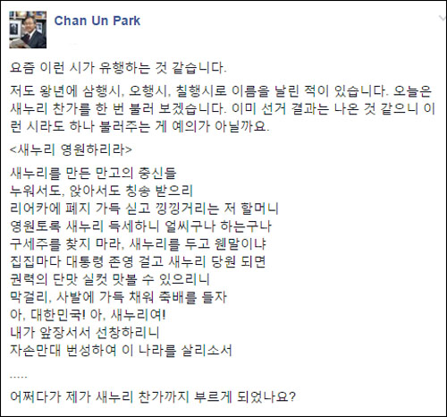 변호사 박찬운 한양대 교수도 페이스북에서 “요즘 이런 시가 유행”이라며 ‘새누리당 영원하리라’란 제목의 풍자시를 소개했다. “새누리를 만든 만고의 충신들 /누워서도, 앉아서도 칭송 받으리 /리어카에 폐지 가득 싣고 낑낑거리는 저 할머니/영원토록 새누리 득세하니 얼씨구나 하는구나”라며 새누리당을 칭송하고 있지만 역시 각 문장의 앞 글자를 읽으면 “새누리영구집권막아내자”라는 비판적 내용을 담고 있다.