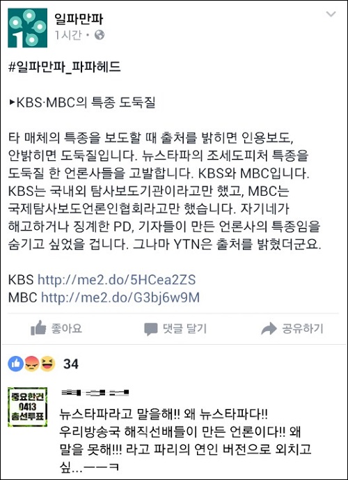 그런가하면 노종면 YTN 해직기자가 참여하고 있는 크라우드 뉴스포털 ‘일파만파’는 페이스북 페이지를 통해 “타 매체의 특종을 보도할 때 출처를 밝히면 인용보도, 안 밝히면 도둑질”이라고 비판했다.