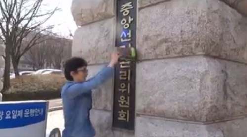 시민활동가 박성수 씨가 <뉴스타파>의 ‘나경원 딸 부정입학 의혹’ 보도에 대해 ‘경고’ 조치를 내린 중앙선거관리위원회에 항의 표시로 개사료를 투척했다.
