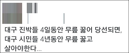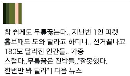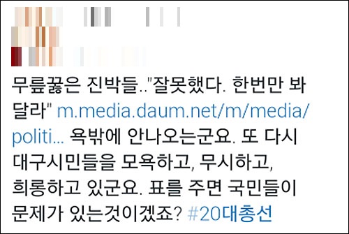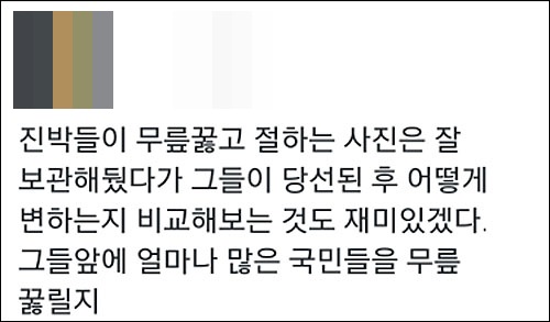 이에 대해 네티즌들은 “선거 때만 되면 눈물 흘리고 무릎 꿇고 읍소하다가 선거 끝남 얼굴에 철판을 깔지”, “지방선거에 대통령 눈물 닦아주라 피켓 1인 시위 선거로 재미 좀 보더니”, “지난번에도 머리끝부터 발끝까지 바뀐다고 도와달라더니~~ 이번에도 쇼하네”, “추접하네, 국회의원 선거에 왜 대통령 얼굴 보고 뽑아달라 하지? 대통령이 만병통치약인가? 나라 빚이 수백조가 늘었는네, 뭘 잘했다고”, “정말 쇼도 이런 쇼는 첨봤다. 목에 힘주며 얼굴에 철판 깐 게 어그저께다. 진박타령하며 국민을 우롱하더니..”, “2주일동안 쇼하고 4년동안 공약은 놀면서 해외여행 다니면서 세금만 쏙쏙 빼먹는 합법적인 도둑놈들”, “정말 퍼포먼스다. 진정성 없는 표구걸 행위. 대구시민이 그렇게 만만한가?”, “대통령을 봐서 더 못 찍어” 등의 반응을 쏟아냈다.