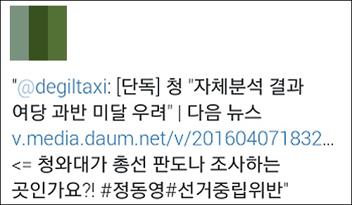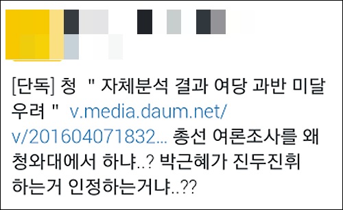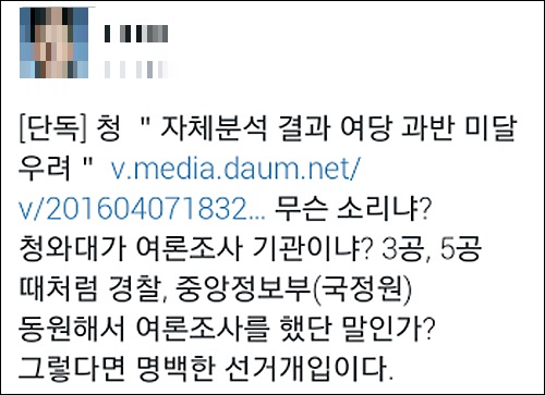 청와대의 판세 분석 보도에 대해 네티즌들은 “총선 여론조사를 왜 청와대에서 하냐? 박대통령이 진두지휘 하는 거 인정하는 거냐?”, “청와대가 여당에 정보를 주는 것 선거개입 아닌가?”, “박근혜 대통령이 위기감 조성해서 새누리당 지지자들 결집시키려는 수작이다. 대놓고 불법을 저지르고 있네”, “선거 개입은 불법일텐데? 교사와 교수 군인 공무원한텐 정치중립을 강요하면서 지들은 왜?”, “아주 대놓고 선거개입? 막장이구나”, “청와대가 선거에 또 개입했다는 확실한 증거다. 선관위는 철저히 수사하라”, “행정부는 선거에서 중립의 의무가 있으며 지켜야하는 법이 있다. 그런데 새누리당에 선거 지시를 했다고?” 등의 반응을 보였다.
