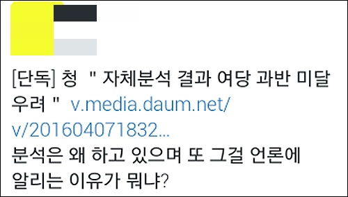 세계일보는 8일 새누리당 핵심 관계자는 7일 “청와대가 20대 총선에서 여당이 과반(150석) 의석을 획득하지 못할 것이란 자체 분석을 당에 알려 왔다”고 밝혔다고 보도했다.