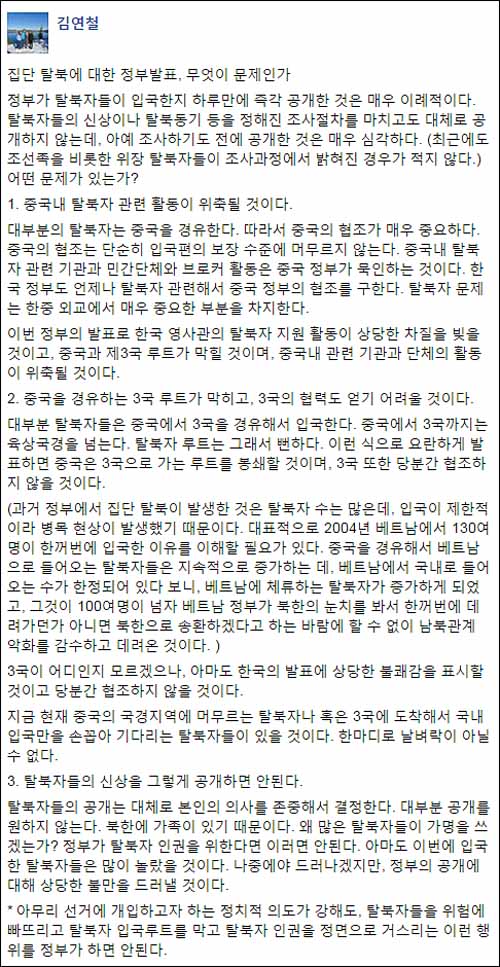 김 교수는 이날 페이스북에서 “아무리 선거에 개입하고자 하는 정치적 의도가 강해도, 탈북자들을 위험에 빠뜨리고 탈북자 입국루트를 막”는 행위라며 이같이 말했다.