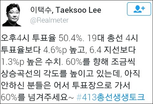 여론조사 전문기관 <리얼미터> 이택수 대표는 이에 앞서 자신의 트위터를 통해 “오후4시 투표율 50.4%. 19대 총선 4시 투표율보다 4.6%p 높고, 6.4 지방선거 보다 1.3%p 높은 수치”라며 “60%를 향해 조금씩 상승곡선의 각도를 높이고 있는데, 아직 안하신 분들은 어서 투표장으로 가서 60%를 넘겨주세요”라고 투표를 독려했다.