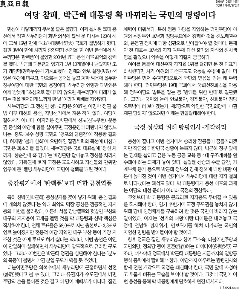 <동아일보>도 사설을 통해 “여당 참패는 박근혜 대통령 확 바뀌라는 국민의 명령”이라고 질타했다.