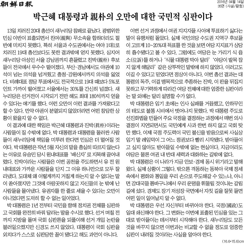 <조선일보>는 14일자 “박근혜 대통령과 親朴의 오만에 대한 국민적 심판이다”란 제목의 사설에서 새누리 참패의 책임은 “박근혜 대통령과 진박(眞朴)이라는 사람들이 질 수밖에 없다”고 비판했다.