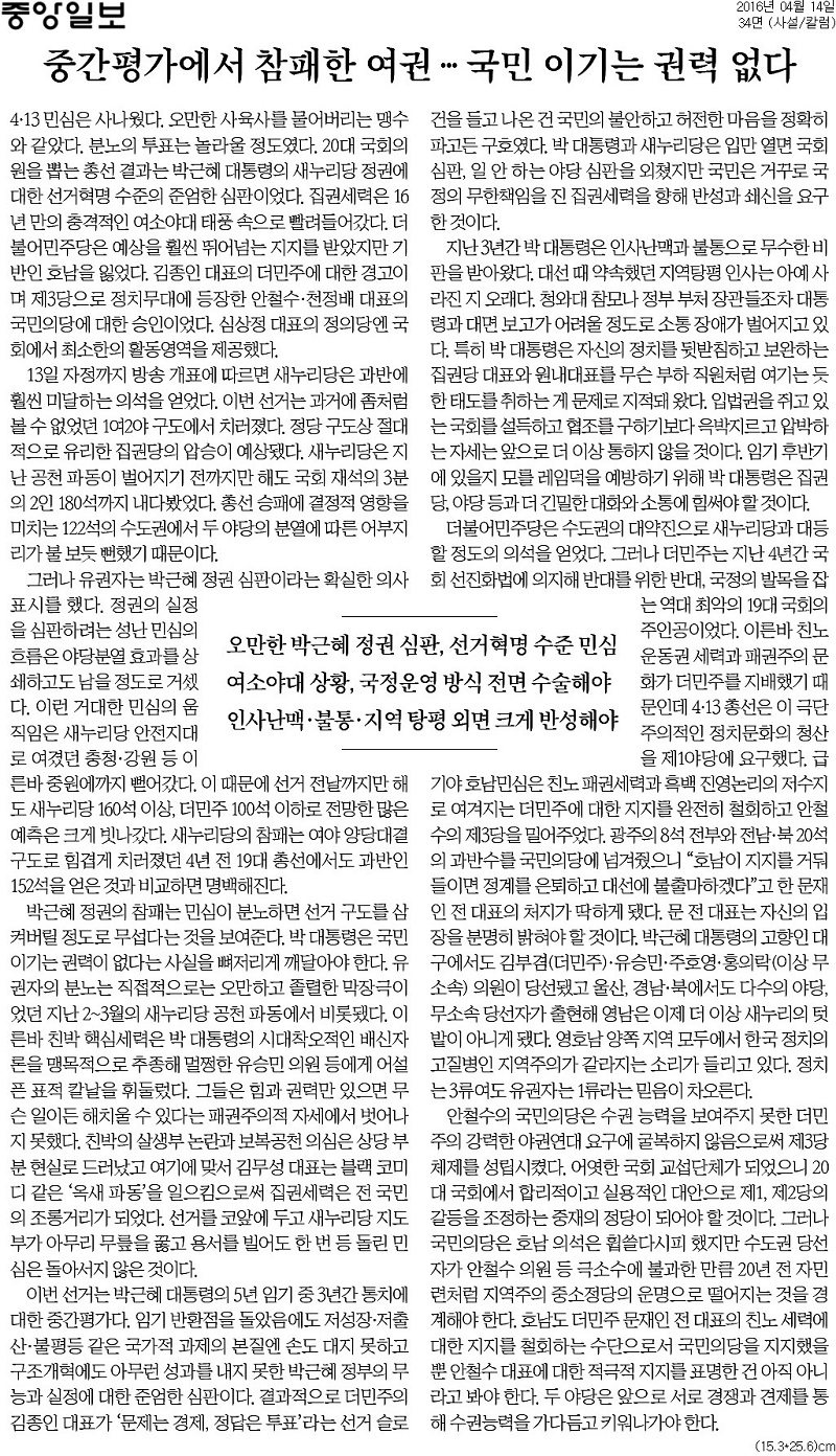 <중앙일보> 또한 “유권자는 박근혜 정권 심판이라는 확실한 의사 표시를 했다”며 “박 대통령과 새누리당은 입만 열면 국회 심판, 일 안 하는 야당 심판을 외쳤지만 국민은 거꾸로 국정의 무한책임을 진 집권세력을 향해 반성과 쇄신을 요구한 것”이라고 지적했다.