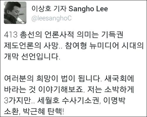 MBC 이상호 기자는 “이번 총선의 또 다른 의미는 제도권 언론을 팟캐스트 대안매체 등 국민 참여형 언론이 앞질렀다는 데 있다”며 “종편 지상파 등 수구 기득권 매체 시대가 가고 수평적 뉴미디어의 시대가 본격화 될 것”이라고 내다봤다. <관련기사 ☞ “4.13민심은 종편‧보수매체 ‘대세론 프레임’ 완강히 거부했다”>